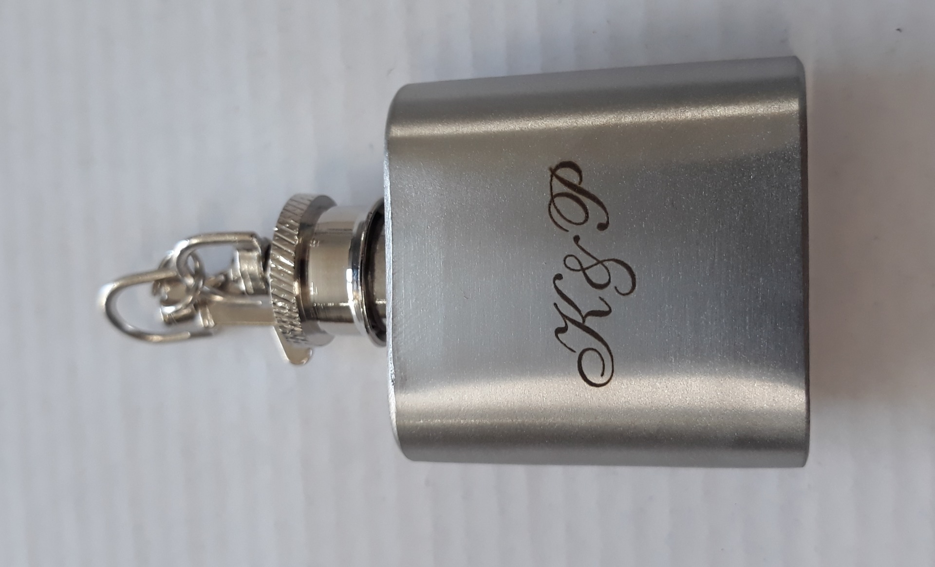 Mini, fém flaska karabinerrel. Űrtartalma: 25 ml. Színe: ezüst, Anyaga: Fém A gravírozás sötétszürke színnel jelenik meg.
