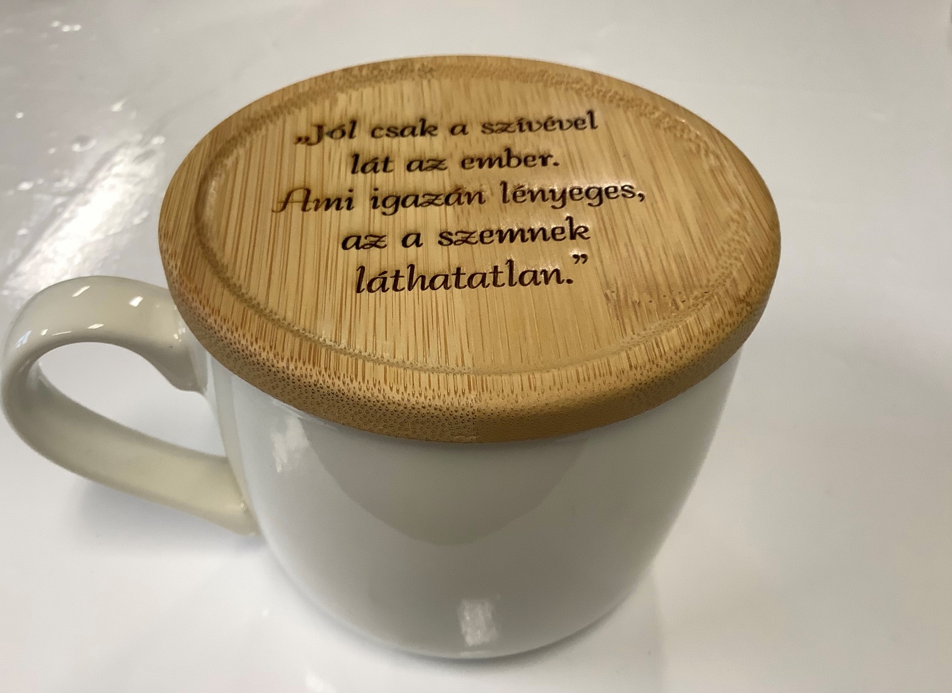 Kiváló minőségű, nagy méretű porcelán bögre (400 ml). Fehérszínű és bambusz poháralátéttel. Ajándékdobozban szállítjuk. A gravírozás a bambusz tetőre/alátétre történik.