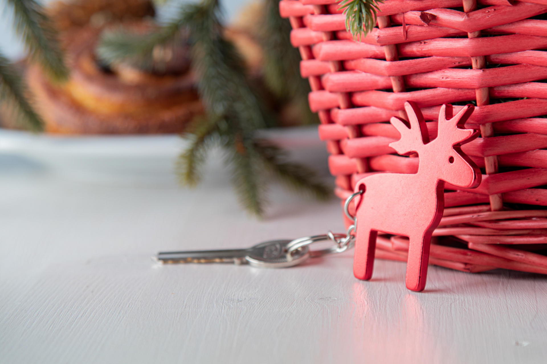 Piros színű szarvas formájú kulcstartó. Mindkét oldala gravírozható. Mérete: 63×55×3 mm Csomagolása: celofán