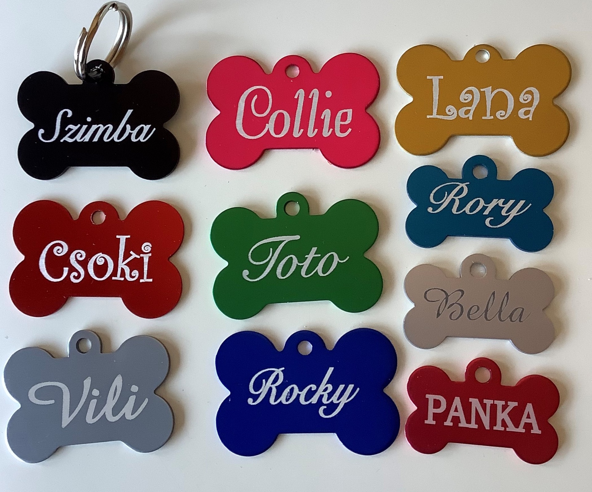 mérete: 38 x 28 x 1 mm A gravírozás fehér színnel jelenik meg. Javasolt szöveg: - egyik oldalon telefonszám - másik oldalon a kutya neve