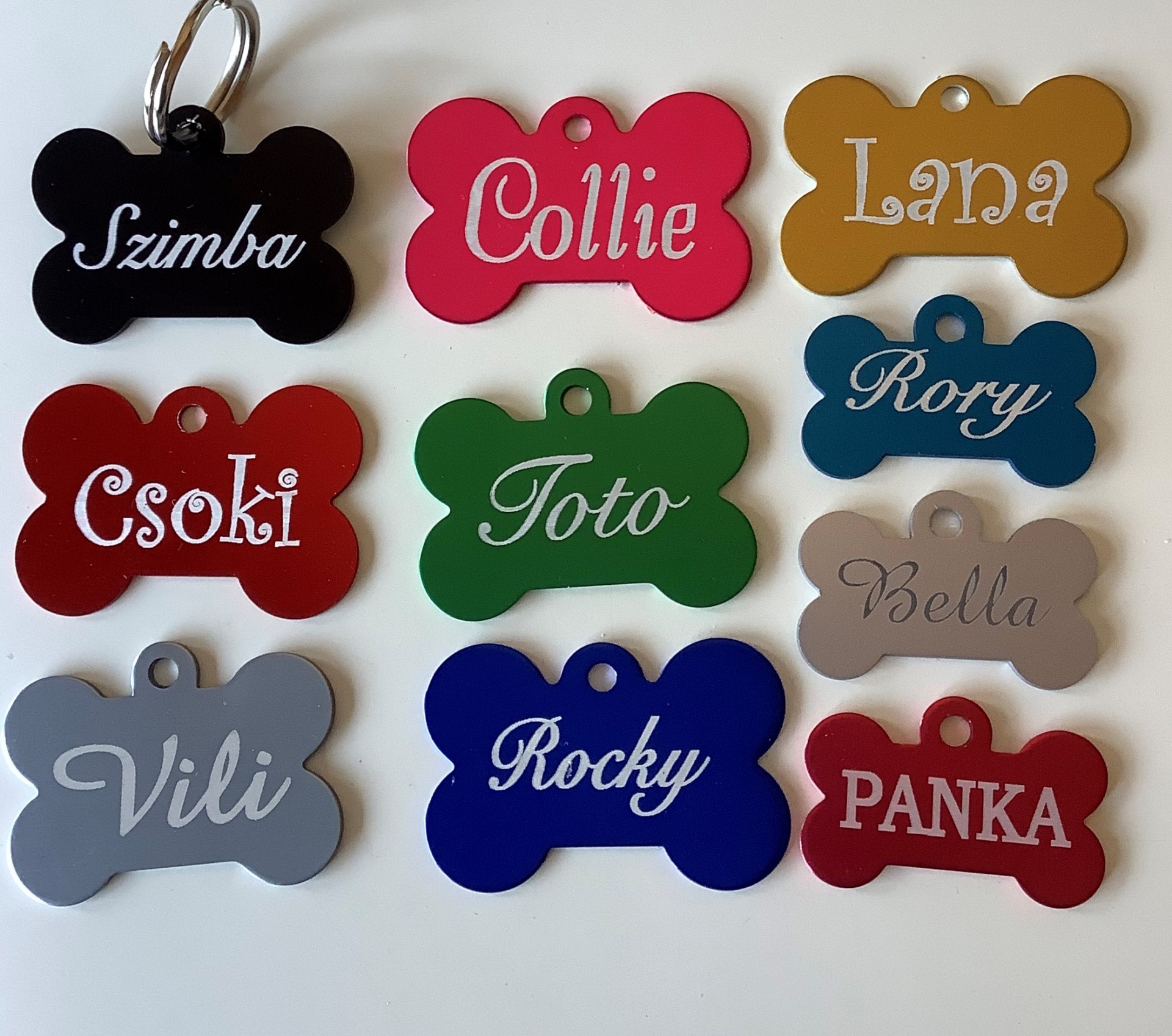 A gravírozás fehér színnel jelenik meg. Javasolt szöveg: - egyik oldalon telefonszám - másik oldalon a kutya neve