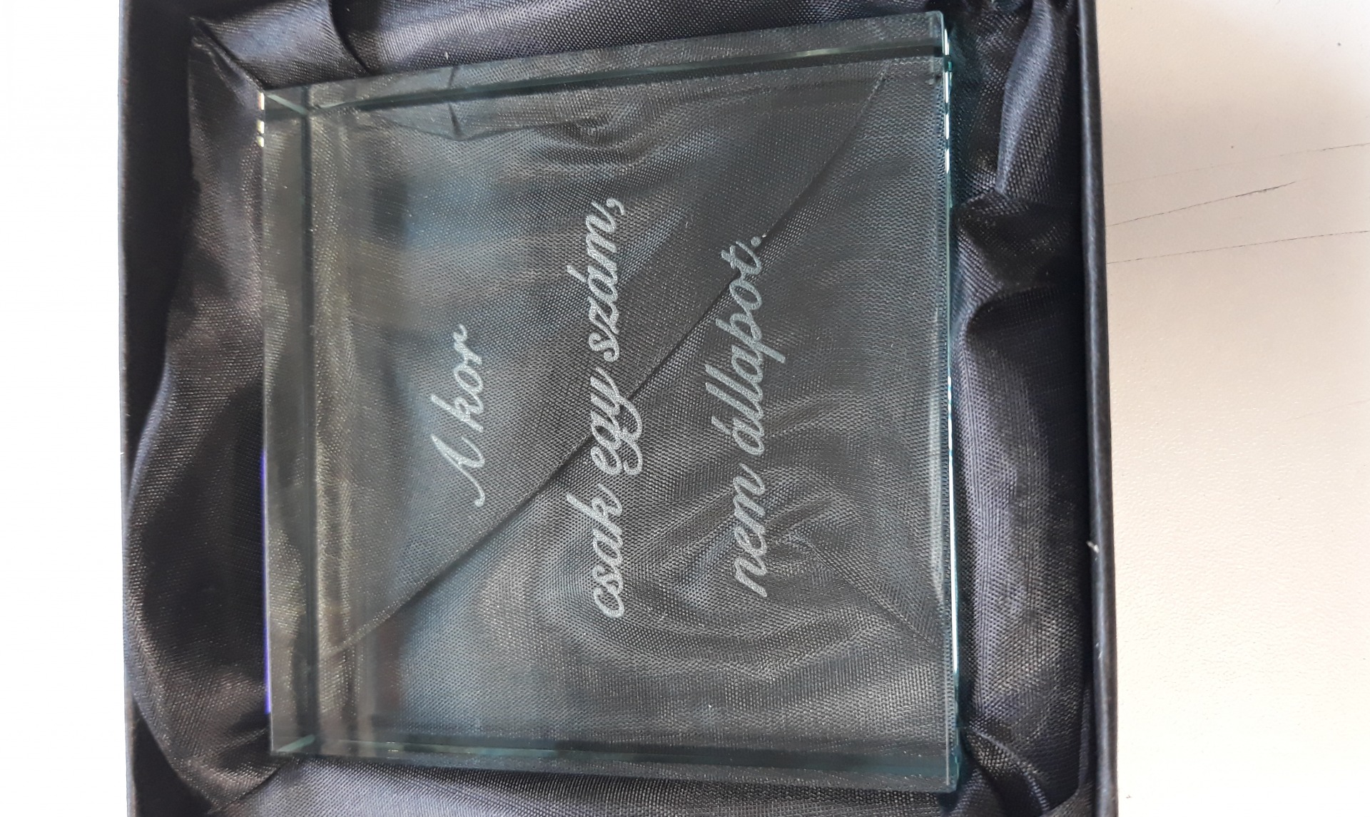 Mérete 8*8*2 cm. Ablakos díszdobozban szállítjuk. A megrendelés végén, a megjegyzés rovatba tudod beírni, hogy milyen elosztásban szeretnéd a gravírozandó szöveget. A gravírozás fehér színnel jelenik meg.