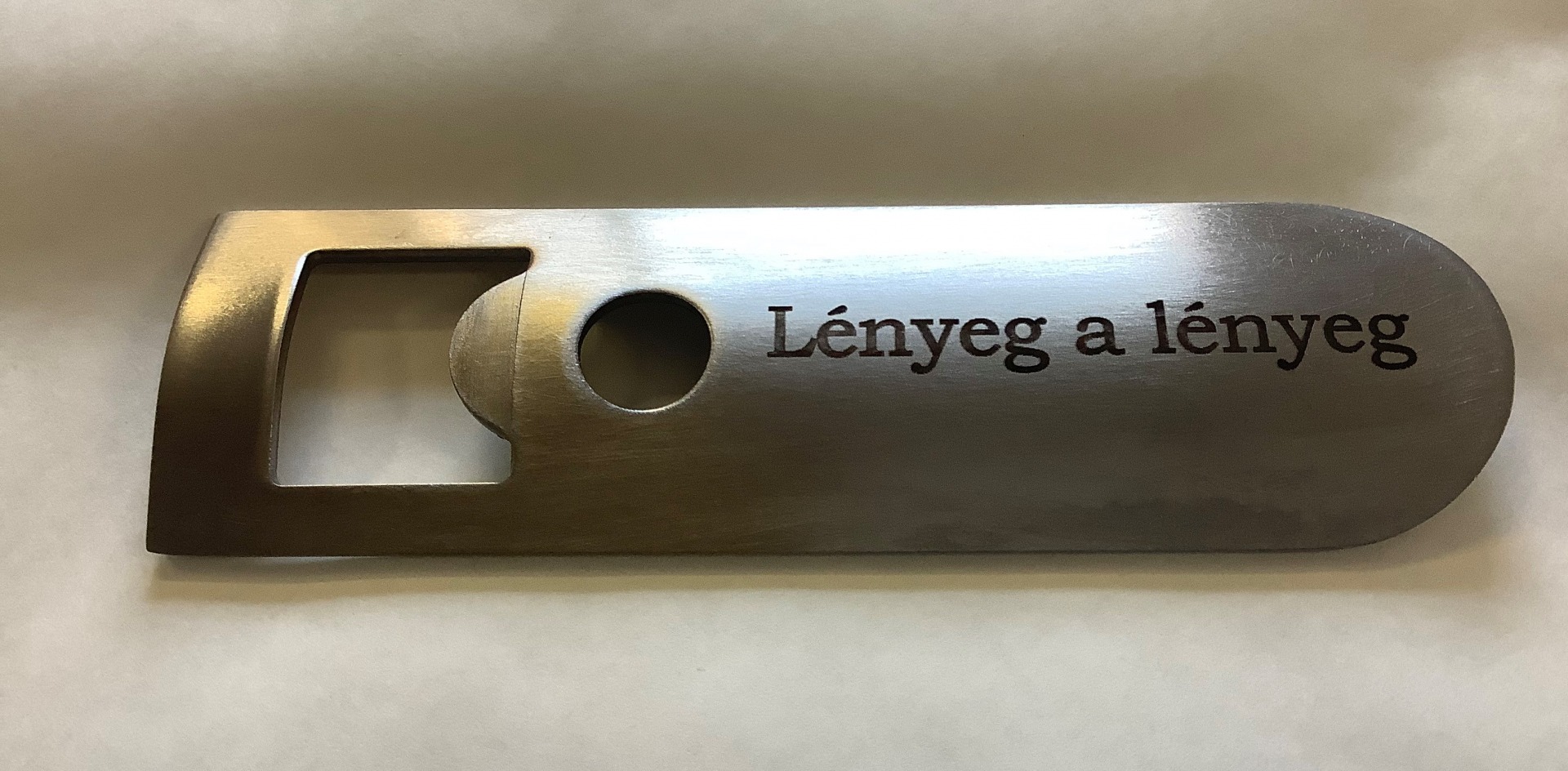Anyaga:fém Szín:ezüst színű Mérete:12 x 15 cm Csomagolása:díszdoboz Jellemzője: üvegnyitó+kulcstartó A kulcstartó mini csavarhúzót rejt. Az üvegnyitó gravírozható.