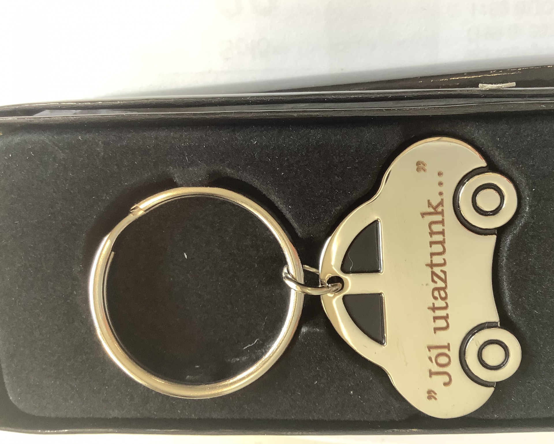 Ezüst színű, autó formájú fém kulcstartó. Mérete: 30*44 mm. Mindkét oldala gravírozható. Csomagolása: celofán