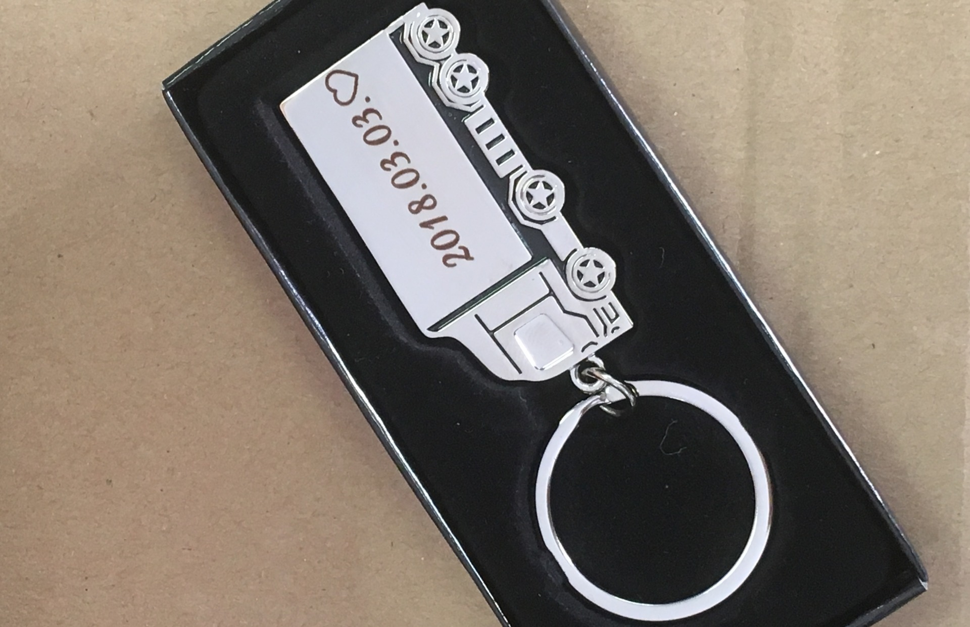 Jól gravírozható, fényes ezüst színű, kamion alakú kulcstartó.