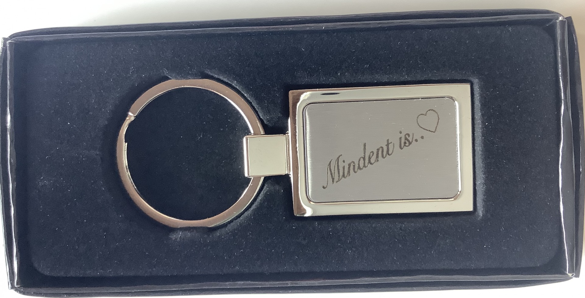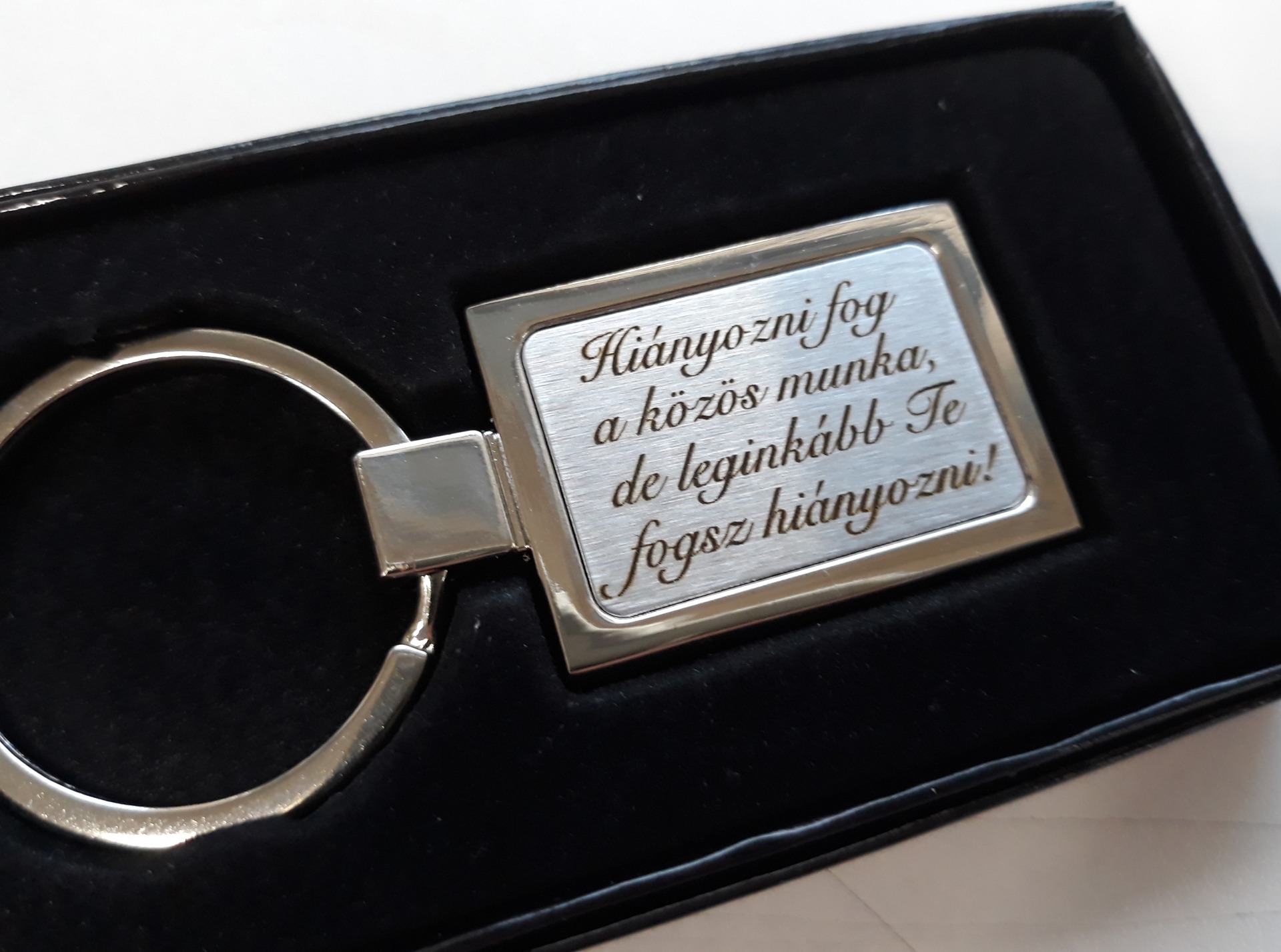 Fémből készült, téglalap alakú kulcstartó. Szín:fényes+matt ezüst Méret:3 x 2,5 x 0,3 cm Csomagolás:papírdoboz
