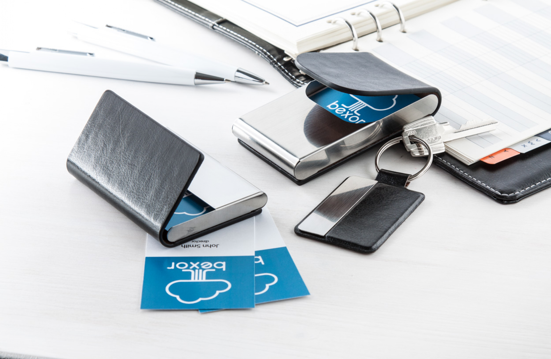 Műbőr borítású szálcsiszolt fém névjegytartó. A gravírozás sötétszürke színnel jelenik meg a fém részben. Fekete papír dobozban szállítjuk.