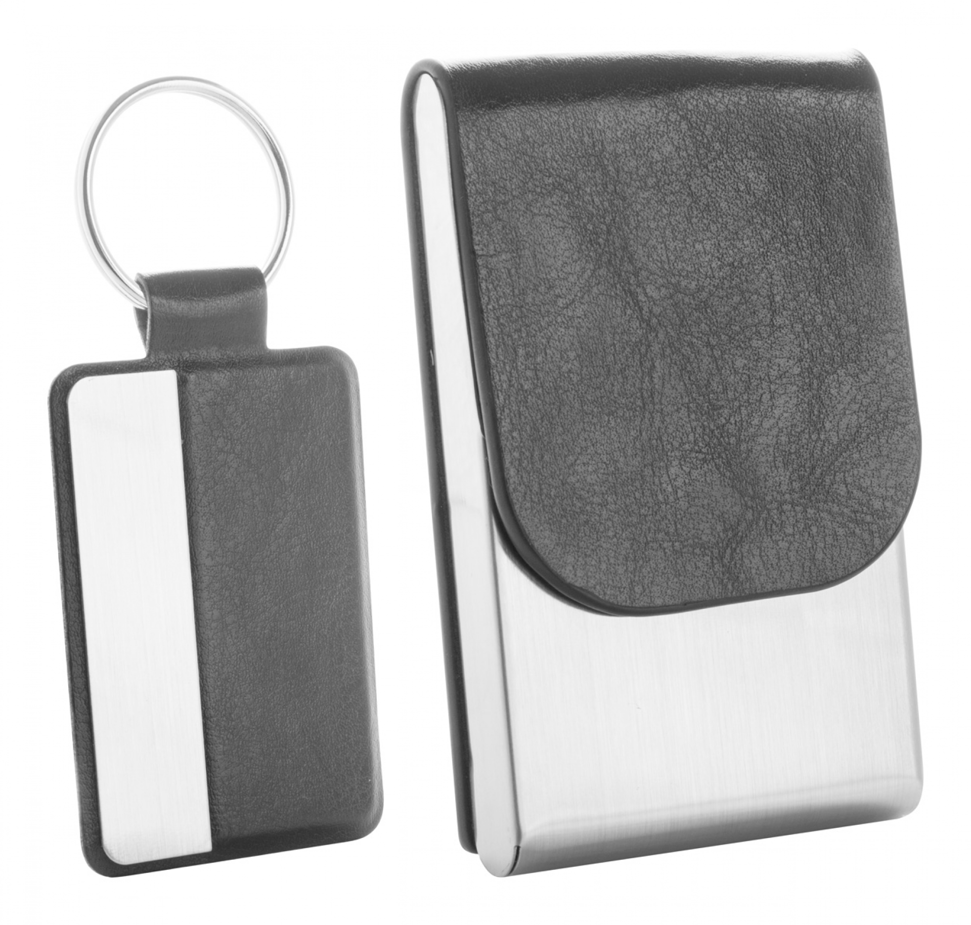 Műbőr borítású szálcsiszolt fém névjegytartó és kulcstartó szett, fekete díszdobozban szállítjuk. A gravírozás a fém részre történik fekete színnel.